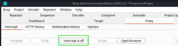 Iniciamos o Burp Suite, mas deixamos o modo “Intercept” dele desligado. A nossa intensao nao e capturar o trafego, mas sim passar uma “sensacao de seguranca” para o navegador
