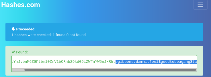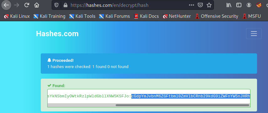 - Passamos o resultado do primeiro hash decodificado para o site novamente. Agora temos um resultado interessante… Parece ser uma credencial