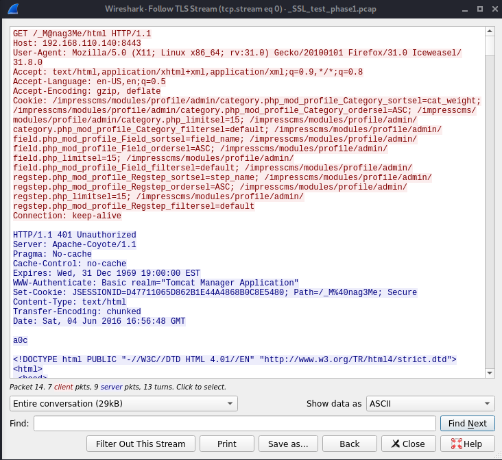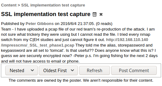- Lembra daquela mensagem dizendo algo sobre conteudos sigilogos no portal? Entao… achamos uma postagem do Peter Gibbons que diz que a senha dos arquivos “storepassword” e “keypassword” e tomcat. Na mensagem ele diz que tem um arquivo .pcap que tem a captura da reproducao do ataque do redteam, mas provavelmente esta criptografado… O arquivo .pcap esta disponivel em: http://192.168.110.140/impresscms/_SSL_test_phase1.pcap