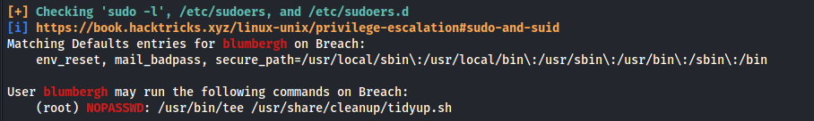 - Conseguimos executar comando com sudo: /usr/bin/tee /usr/share/cleanup/tidyup.sh