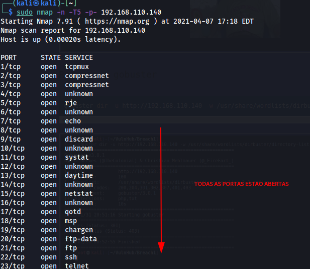 - Com o parametro “-p-“ do nmap varremos todas as portas possiveis do nosso alvo e para a nossa surpresa TODAS as portas estao ABERTAS
