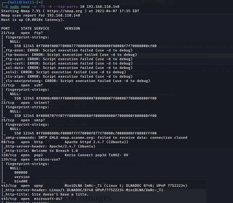 - Agora com o parametro “-A” do nmap vamos descobrir mais informacoes sobre os principais servicos. Primeiramente vamos enumerar somente as 10 principais portas
