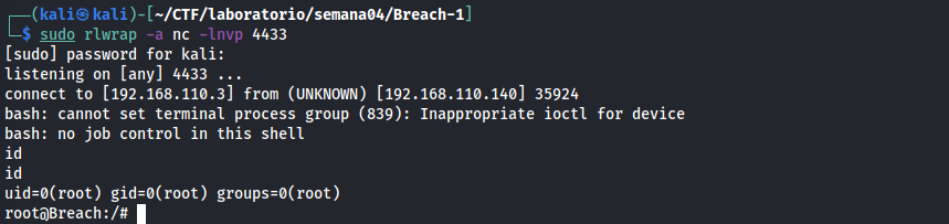 - Agora e so deixar a porta escutando na kali e reiniciar a maquina alvo que conseguiremos o nosso shell de root!