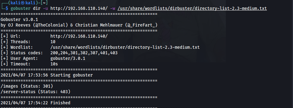 gobuster dir -u http://192.168.110.140/ -w /usr/share/wordlists/dirbuster/directory-list-2.3-medium.txt