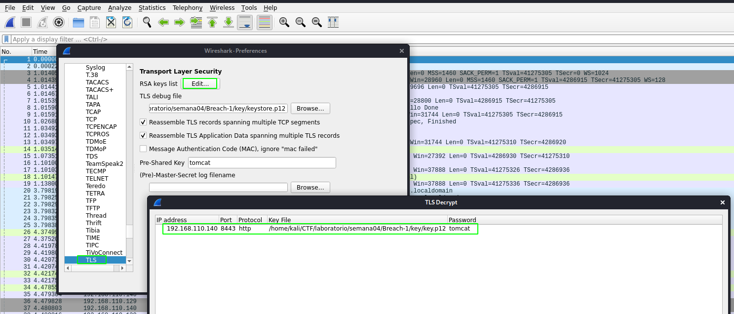 - Para poder ler o conteudo criptografado da captura no wireshark devemos importar o arquivo para o programa da seguinte forma: “Edit: -> “Preferences” -> “Protocols” -> “TLS -> “Edit”