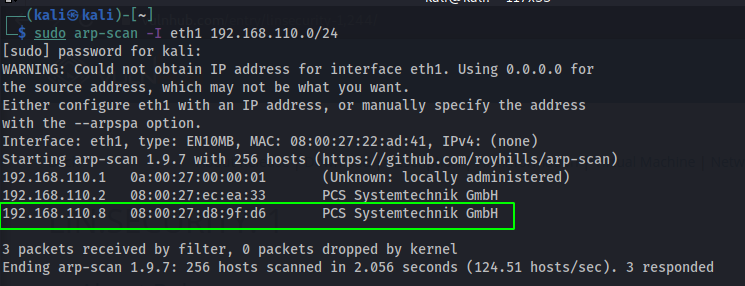 Com o comando arp-scan varremos a rede para descobrir os hosts ativos e consequentemente o IP do nosso alvo: 192.168.110.8