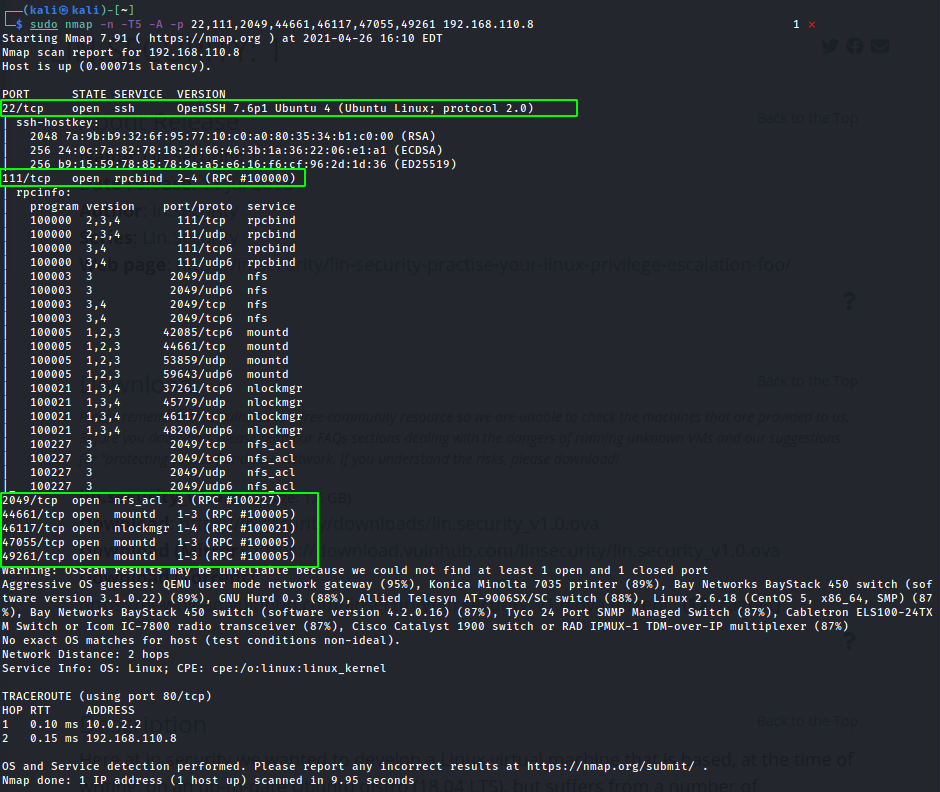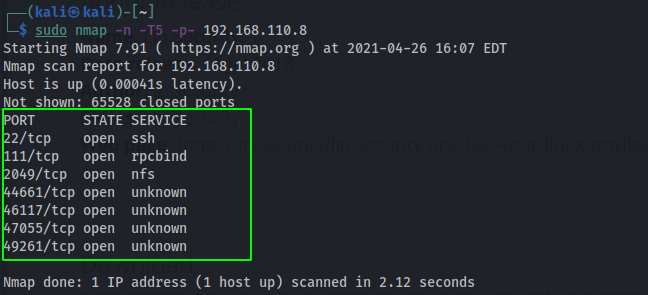 sudo nmap -n -T5 -A -p 22,111,2049,44661,46117,47055,49261 192.168.110.8