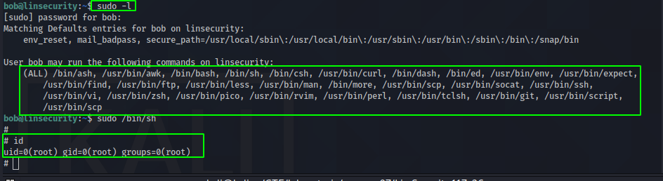Verificamos com o comando sudo -l que podemos executar varios binarios como sudo. Entao temos varias formas pra poder escalar privilegio. Por hora vamos utilizar o /bin/sh