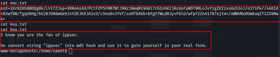 - Lendo os arquivos gerados pelo enc temos um texto criptografado e uma dica informando que a chave para descriptografar e a string “ippsec” convertida para hash md5
