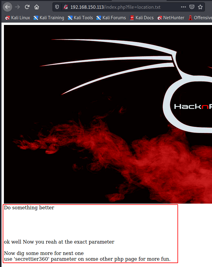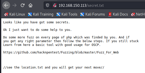 secret.txtque nos chamou atencao. Acessando ele temos algumas dicas. A primeira dica que ele nos da e para fazer o fuzzy nas paginas php, a segunda dica que ele nos da e para utilizar owfuzze na ultima dica ele nos diz que o proximo passo esta nolocation.txt