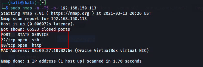 sudo nmap -n -T5 -A -p 22,80 192.168.150.113