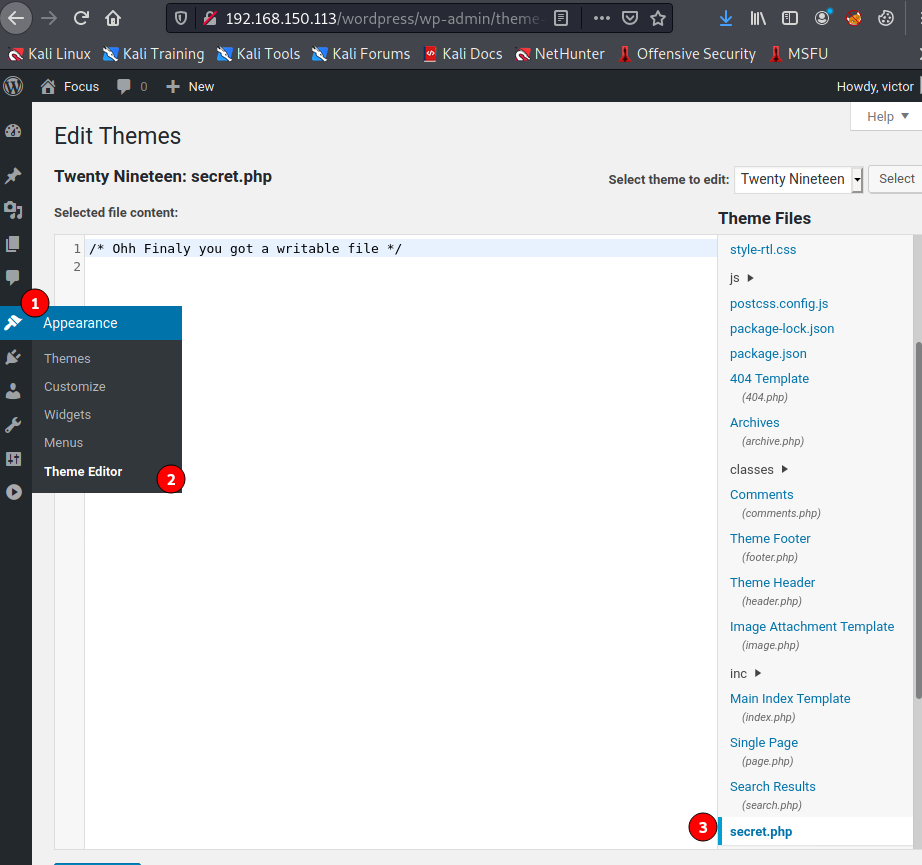 secret.php, que no seu conteudo nos diz que finalmente achamos um arquivo gravavel. Para chegar ate ele entramos na aba “Appearance” > “Theme Editor” > “secret.php”