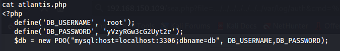 - Ao listar os arquivos do diretorio em que estamos, /var/www/html, vemos os arquivos da pagina web. Lendo o arquivos atlantis.php* vemos que ele tem no codigo as credenciais para acessar o banco de dados da aplicacao.
