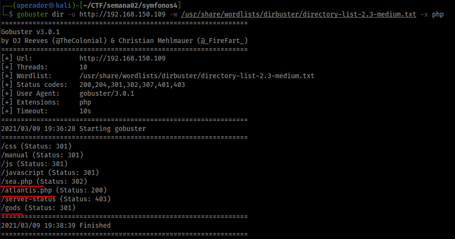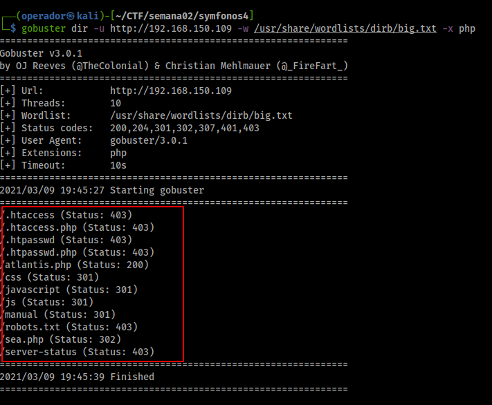 - Executamos o gobuster com a wordlist /usr/share/wordlists/dirb/big.txt. Encontramos os arquivos sea.php e atlantis.php