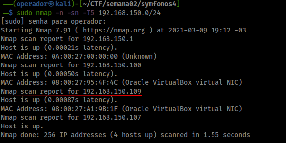 sudo nmap -n -sn -T5 192.168.150.0/24