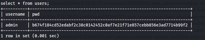 - Verificando a tabela users temos duas colunas: username e pwd. O conteudo da tabela parece que e um nome de usuario “admin” e algo que parece um hash