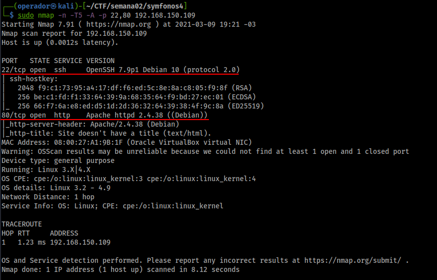 sudo nmap -n -T5 -A -p 22,80 192.168.150.109