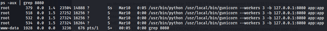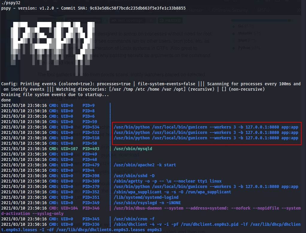 - Ao executar o PSPY podemos verificar que esta sendo executado algo com o python e interagindo com a porta 8080 da maquina.