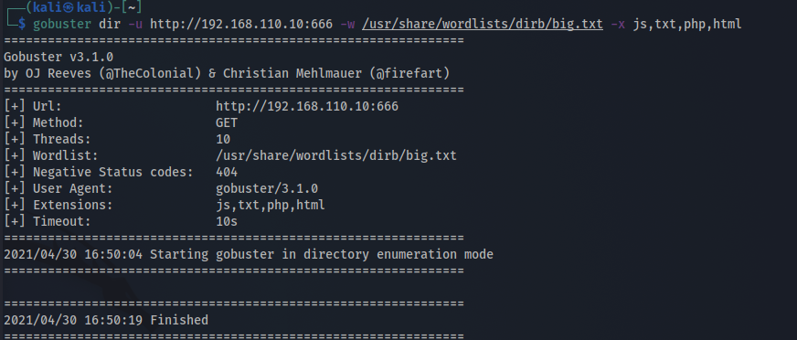 gobuster dir -u http://192.168.110.10:666 -w /usr/share/wordlists/dirb/big.txt -x js,txt,php,html