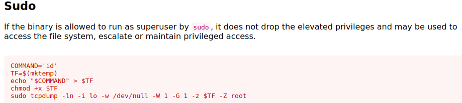 Verifiquei no portal GTFOBINS o que poderia ser explorado para conseguir escalar privilegio. Encontramos respostas promissoras para o tcpdump