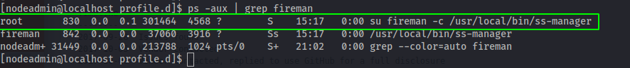 Seguindo a metodologia revirei a maquina inteira atras de uma vulnerabilidade que me permitisse escalar privilegio. Encontrei depois de muito tempo, nos processos, algo sendo executado, filtrando pelo usuario fireman
