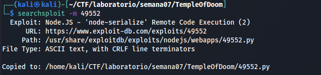 Encontramos dois exploits de RCE que a principio podem atender a necessidade. Vamos copiar o nodejs/webapps/49552.py para o diretorio atual