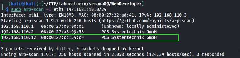Com o comando arp-scan varremos a rede para descobrir os hosts ativos e consequentemente o IP do nosso alvo: 192.168.110.12