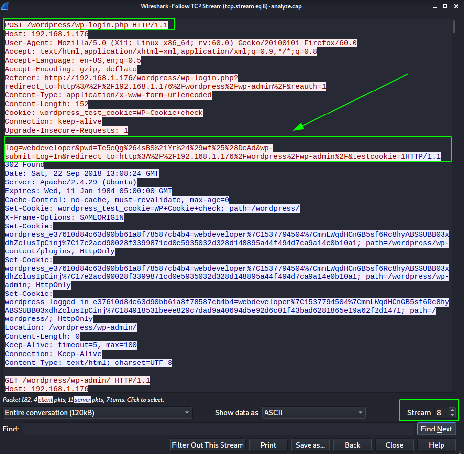 Analizando o arquivo analyze.cap com o wireshark, clicando com o Botao direito do mouse -> Follow -> TCP Stream, conseguimos achar no Stream 8 o envio por “POST” de um formulario onde contem as informacoes de login e senha do usuario “webdeveloper”, queencontramos com o wpscan.