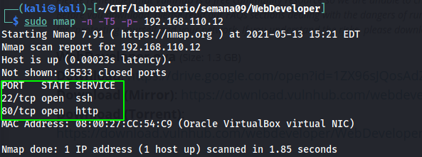 sudo nmap -n -T5 -A -p 22,80 192.168.110.12