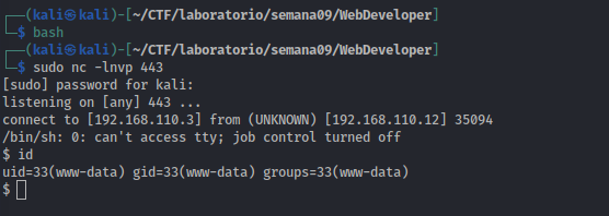 Para conseguir o shell reverso, primeiramente invocamos o bash para conseguir melhorar o shell posteriormente, depois deixamos a porta aberta. Depois de passar o payload via URL recebemos o shell do alvo!