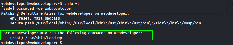 Seguindo a metodologia a primeira coisa que verificamos foi se o usuario tem permissao para usar algum comando com o sudo. Agora sabemos que o usuario pode executar o tcpdump como root, usando o sudo.