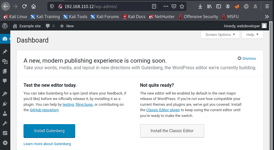 Conseguimos acessar o painel de administracao do WP com a credencial webdeveloper:Te5eQg&4sBS!Yr$)wf%(DcAd.