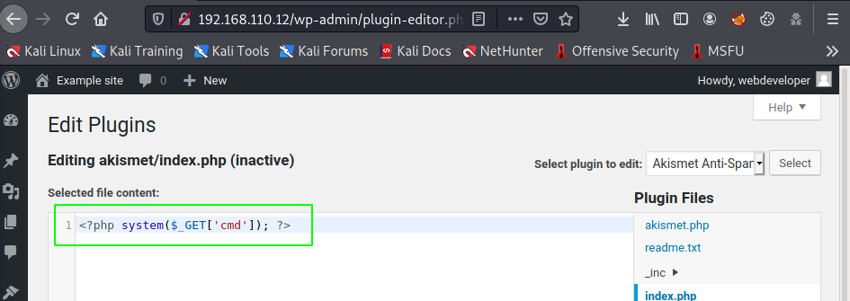 Editamos a pagina akismet/index.php com o “php do mal”, para ver se conseguimos RCE.