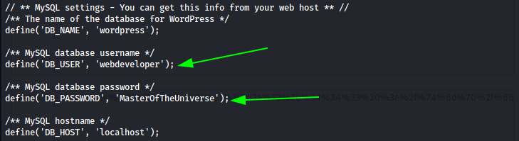 Conseguimos achar a credencial para acessar o banco de dados no arquivo /var/www/html/wp-config.php